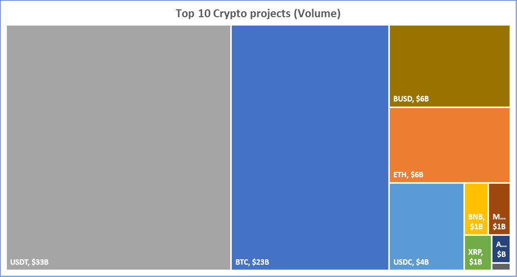 The Interesting thing to note here is that although Tether (USDT) has just $70B market cap, it is traded the highest with volume close to $33B given its use as a stablecoin for the exchange of assets. Meanwhile, Stablecoin market cap is at $137 Billion and has a 11.71% share of the total crypto market cap.