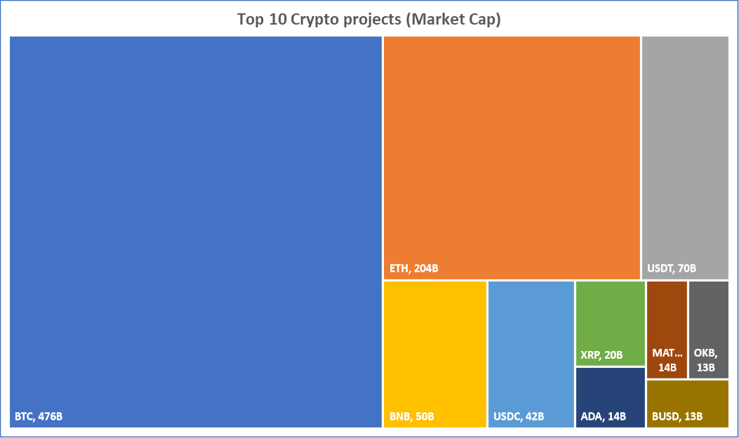Bitcoin (BTC) is the largest cryptocurrency with a market cap of $476 Billion.